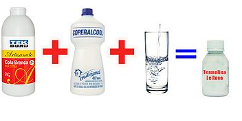 Você irá precisar apenas de: cola branca comum, álcool líquido (não serve álcool em gel) e água.